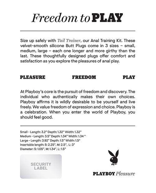 Discover the pleasures of anal play safely and comfortably with the Playboy Tail Trainer 3-Piece Set from Evolved Novelties. This graduated anal training kit features three velvety-smooth silicone plugs, each slightly larger and more girthy than the last, allowing you to progress at your own pace. With flexible shafts, stimulating grooves, and tapered tips for easy insertion, these plugs are perfect for beginners and experienced users alike.